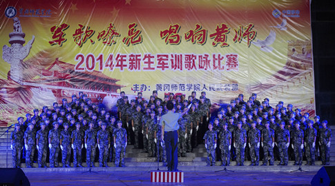 军歌嘹亮,唱响黄师。9月21日晚,由学工部、武装部主办的2014年新生军训歌咏比赛在南区教学楼广场举行。音乐学院荣获特等奖,旅游文化与地理科学学院荣获一等奖,新闻与传播学院、化工学院、电子信息学院荣获二等奖,数理学院、商学院、政法学院、国际教育学院、美术学院荣获三等奖。