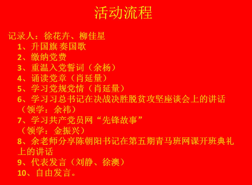 余杨老师带领重温入党誓词;肖延量老师传达学习了习近平总书记在3月4日中共中央政治局常务委员会会议和3月6日决战决胜脱贫攻坚座谈会上的重要讲话精神,教育部、湖北省委、学校党委近期有关会议、通知精神;余祎同志领学了《习总书记在决战决胜脱贫攻坚座谈会上的讲话》;金振兴同志分享了《共产党员“先锋故事”》。