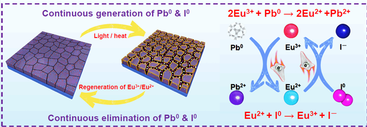 图1.氧还离子对Eu3+/Eu2+循环消除Pb0和I0缺陷和Pb2+/I-离子对再生的机理图。