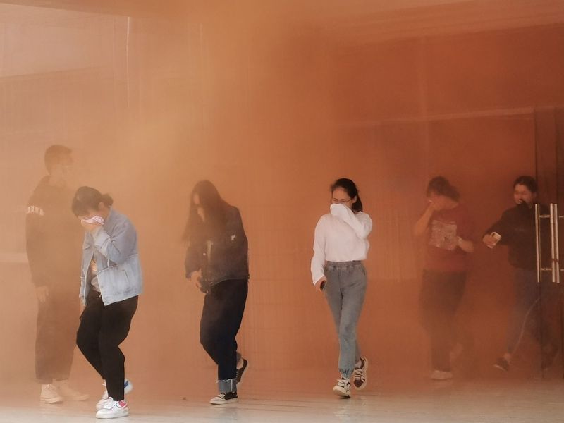 警报声响,同学们沉着冷静,用湿毛巾捂住口鼻, 听从楼内疏散人员的指令,弯腰有序地下楼, 疏散人员按照预先的消防演习方案疏散学生,保证楼内学生的安全,以免慌乱中出现拥挤或者踩伤学生现象。