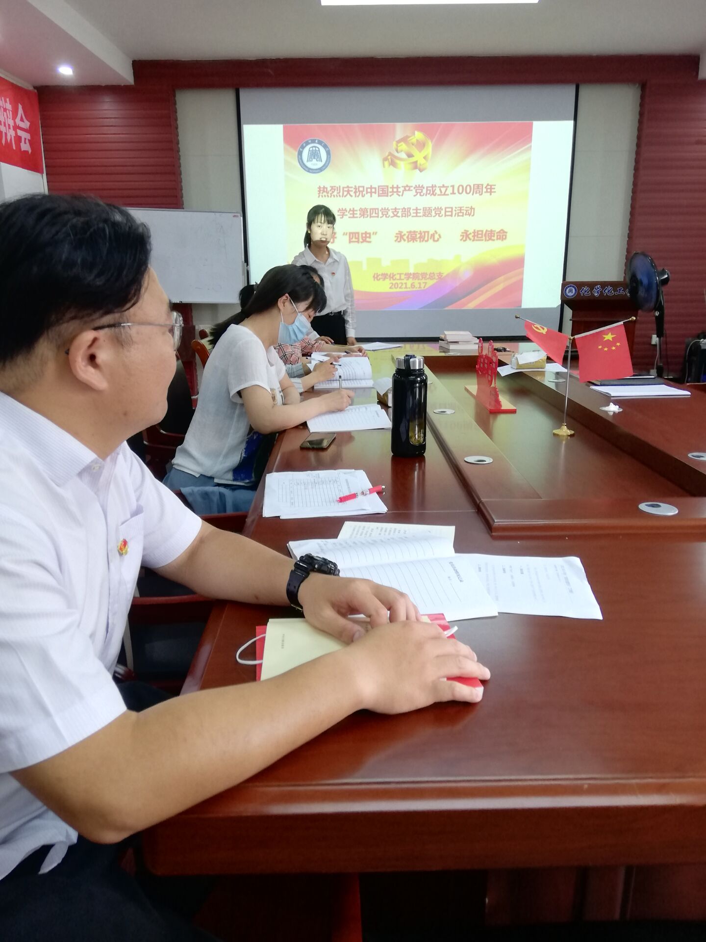 617日下午,化学化工学院学生四个党支部分别在化学楼407会议室、连廊508党员活动室等地开展“学好“四史”,永葆初心、永担使命”支部主题党日活动,活动由党支部书记主持。
