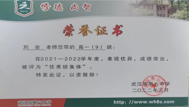 黄师精神“尚师表、勇担当、秉诚朴、图自强”是在学校学习的知识,更是作为一个黄师人从事教育工作的初心。刘会初到武汉六中,初次接触青春活力的学生,初次担任班主任……这一切对于一个刚从事教师工作不久的年轻人来说,是陌生的,是挑战的,更是兴奋的,但她没有胆怯,更多是将黄师精神融入到自己的工作中,勇敢的面对挑战。每到一个班级,她从记住每位同学的名字开始,到了解每位同学的性格,再到做同学家访去与家长沟通,从陌生到熟悉,慢慢走近每位学生,走进每位学生的内心,赢得了学生家长和学生的认可。她从严肃地给班级定规矩开始,到教每位学生去尊重同学,再到班级团结向上、勇夺区/校优秀班级称号,从严肃到活泼,慢慢成为一个团队,慢慢成为相亲相爱的一家人。多少次耐心细致的跟学生谈话,多少次穿梭在家访的路上,她没有抱怨,没有气馁,只为了教育好每一个学生。
