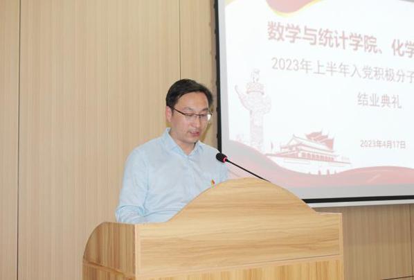 为认真贯彻落实党员发展细则,扎实入党积极分子的党史教育基本功,提高入党积极分子的基本素养。数学与统计学院、化学化工学院于4月17日晚19:00在博学楼B01举行了2023年上半年入党积极分子培训班结业典礼,顺利完成所有培训内容。本次入党积极分子培训班结业典礼由化学化工学院党委副书记龙刚主持,数学与统计学院党委书记陈世辉、党委副书记陈琛、学生第一党支部书记杜雯、化学化工学院党委书记邱浩、学生第一党支部书记余杨出席此次活动。