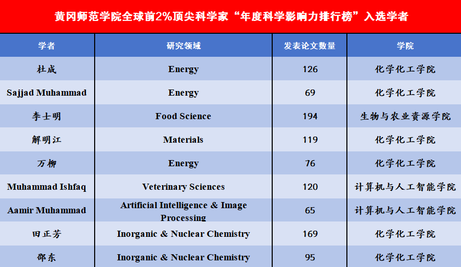 当地时间9月19日,美国斯坦福大学和国际权威学术出版社爱思唯尔共同发布了2025年全球前2%顶尖科学家榜单,我校杜成、Sajjad Muhammad、李士明、解明江、万柳、Muhammad Ishfaq、Aamir Muhammad、田正芳、邵东9位学者入选“2025年度科学影响力排行榜”榜单,其中6位为我院学者。入选学者主要贡献学科方向涵盖Energy、Food Science、Materials、Veterinary Sciences、Artificial Intelligence & Image Processing、Inorganic & Nuclear Chemistry等多个领域。