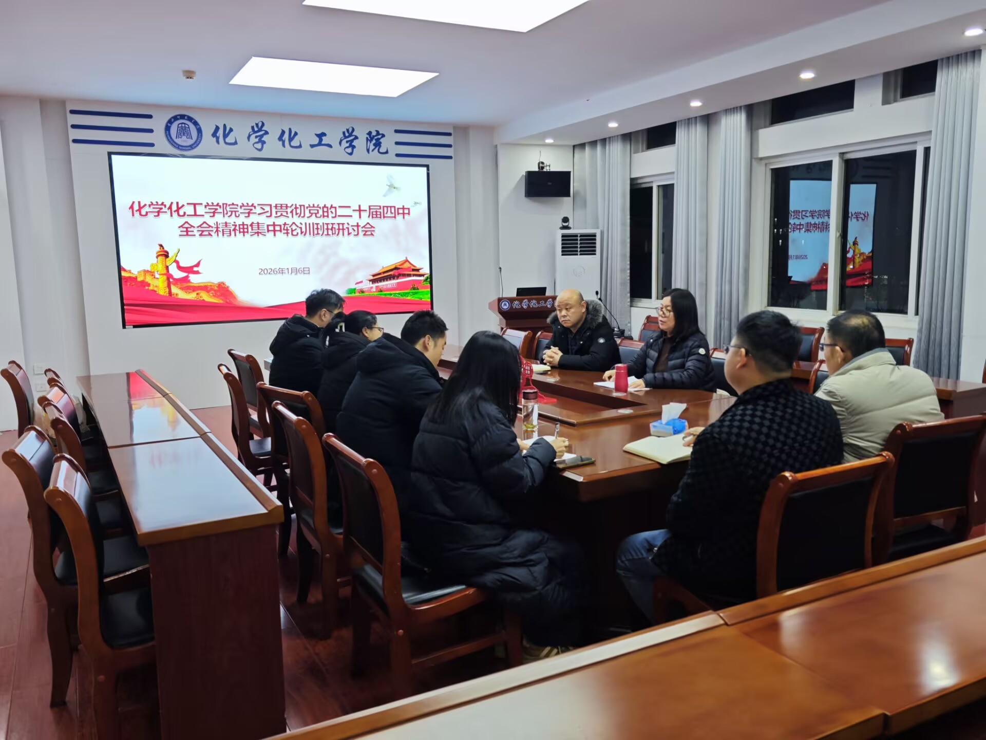 2026年1月6日,化学化工学院在化学楼407会议室召开学习贯彻党的二十届四中全会精神集中轮训班研讨会。院党委书记汪辉、院长田正芳带领班子成员及辅导员、教学秘书代表参会。会议由院党委书记汪辉主持。