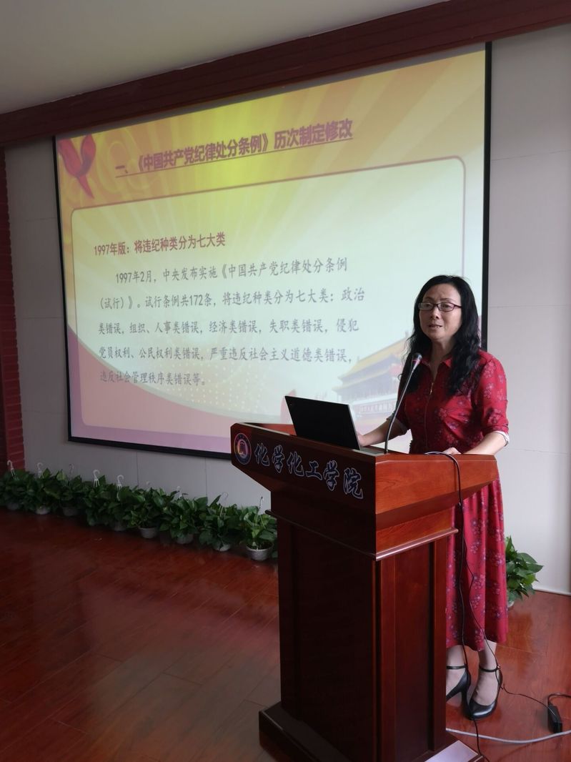 为落实第二十个党风廉政建设宣传教育月活动安排,5月27日下午4点,化学化工学院党总支书记施向荣同志在化工楼407会议室给全体教职工上了一堂题为“把党的纪律刻印在心上”的廉政党课,施向荣同志讲了《中国共产党纪律处分条例》历次制定修改情况、新《条例》有哪些特点、新《条例》中哪些硬杠杠不可触碰、把党的纪律刻印在心上四个方面的内容,整个课堂上气氛严肃,庄重。教职工听后,对《中国共产党纪律处分条例》有了进一步的认识,党员同志的廉洁意识得到进一步加强。