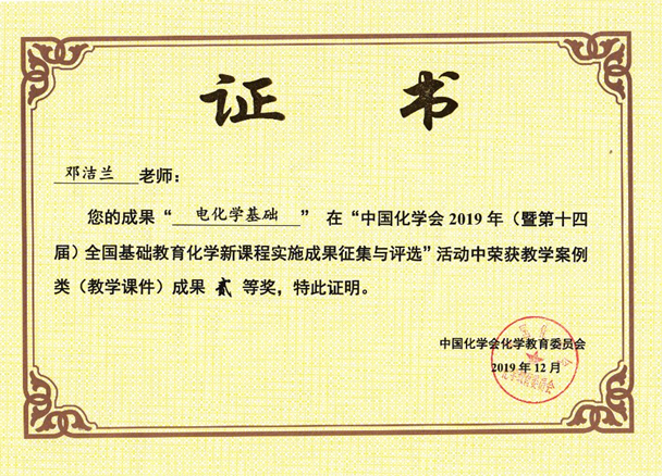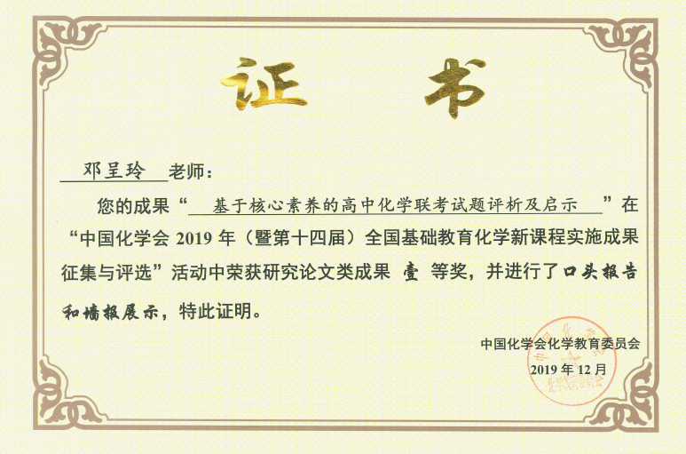 12月6日-12月8日,由中国化学会主办,中国化学会化学教育委员会、北京师范大学化学学院化学教育研究所、《化学教育(中英文)》杂志、山东省潍坊市昌乐县第一中学承办的“第十四届全国基础教育化学新课程实施成果交流大会”在山东省潍坊市隆重举行。化学化工学院学科教学(化学)教育硕士研究生邓呈玲同学获研究论文类成果一等奖并做头口报告和墙报展示;邓洁兰同学获研究论文类成果二等奖1项、教学案例类(教学课件)成果二等奖1项、习题和试题设计类成果三等奖1项。