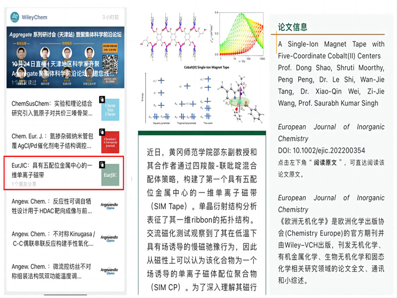 据悉,邵博士的研究成果此前还被世界著名的Wiley出版社在其国内化学唯一公众号WileyChem里进行了报道(链接:https://mp.weixin.qq.com/s/w7wEGqxV3KxV3vEbDt_HEg。Eur. J Inorg. Chem., 2022, 2022, e202200354.)。Wiley出版社是世界著名出版社,WileyChem公众号旨在推送前沿优秀化学研究成果,促进化学研究持续发展。只有极少数发表在Wiley出版社旗下化学期刊的优秀化学成果才能被推介。