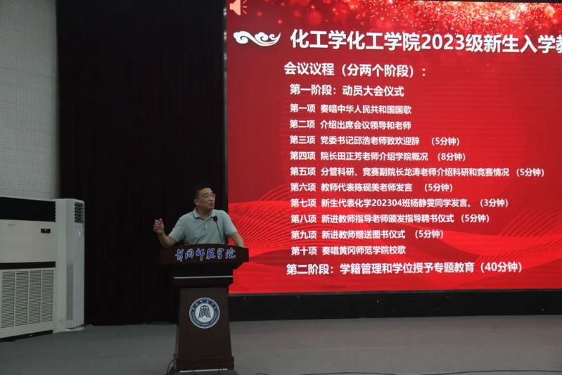 2023年9月11日,化学化工学院2023级新生入学教育动员大会在南区学术交流中心举行。学院党委书记邱浩、院长田正芳、院党委副书记龙刚、副院长龙涛、蒋小春,学院办公室主任、各专业负责人和教研室主任、教学秘书、科研秘书、辅导员、新生班主任、新进教师、新进教师指导老师以及到校2023级本科生和研究生出席本次大会。大会由院党委副书记龙刚主持。