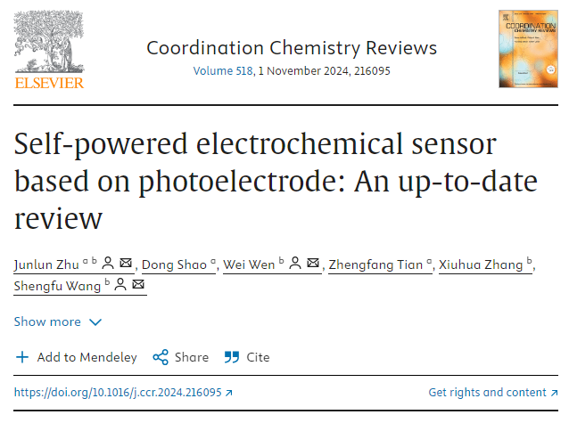 近日,我校化学化工学院祝俊伦博士课题组在Coordination Chemistry Reviews上发表题为“Self-powered electrochemical sensor based on photoelectrode: An up-to-date review”的综述论文(Coordination Chemistry Reviews, 2024, 518, 216095. DOI: 10.1016/j.ccr.2024.216095)。祝俊伦博士为第一作者兼通讯作者,我校邵东副教授、田正芳教授参与了相关工作,湖北大学化学化工学院文为教授和王升富教授分别为第二、第三通讯作者,英国365集团官网为第一单位(图1)。该工作得到国家自然科学基金资助。《Coordination Chemistry Reviews》是中科院SCI化学大类一区Top期刊,影响因子20.3。