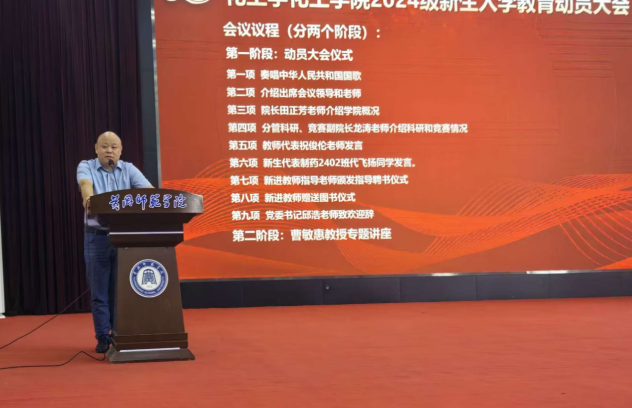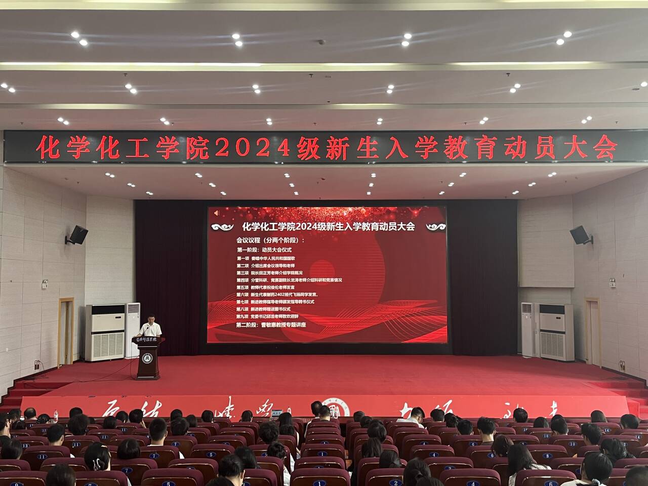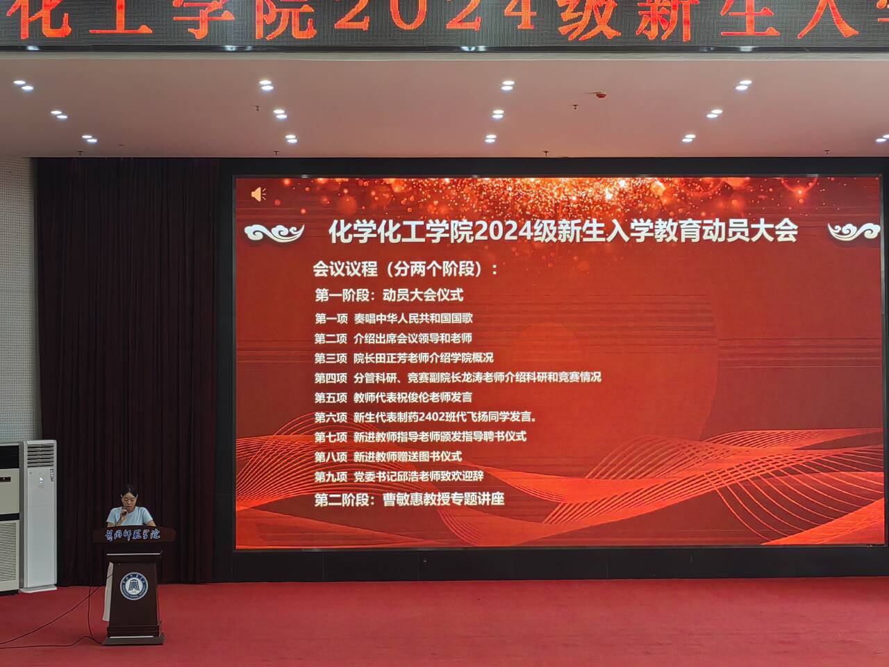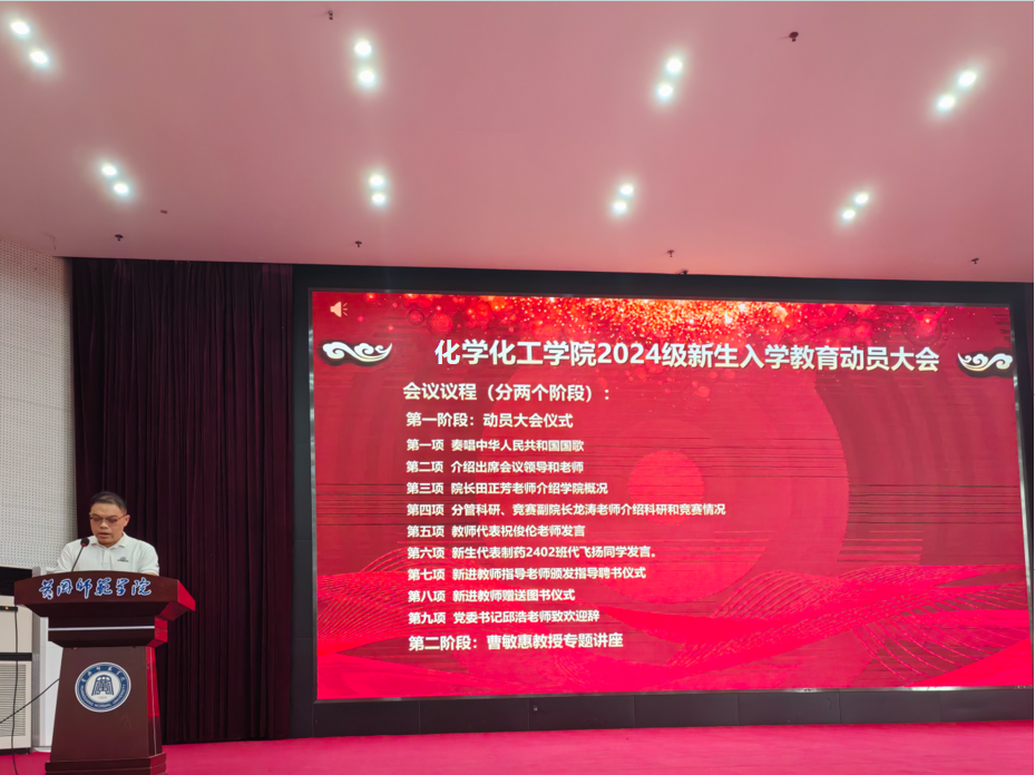 2024年9月11日,化学化工学院2024级新生入学教育动员大会在南区学术交流中心举行。院党委书记邱浩、院长田正芳出席会议,学院办公室主任、各专业负责人和教研室主任、教学秘书、科研秘书、辅导员、新生班主任、新进教师、新进教师指导老师以及到校2024级本科生和研究生参加本次大会。大会由辅导员李东主持。
