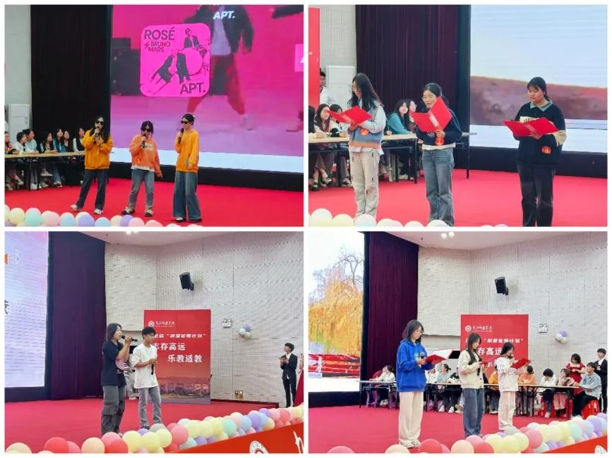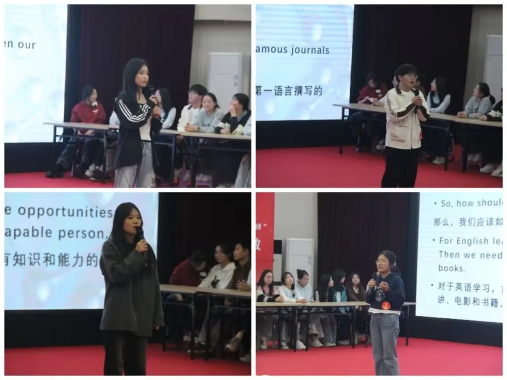 第二个环节为“词汇王”争霸赛。参赛队伍以班级为顺序,随机抽取题库现场答题,他们带着满满的自信与期待,思维敏捷,快速理解题目并组织答案。师生们被参赛者们的精彩表现所吸引,不时爆发出阵阵喝彩声,整个现场气氛热烈,热火朝天。