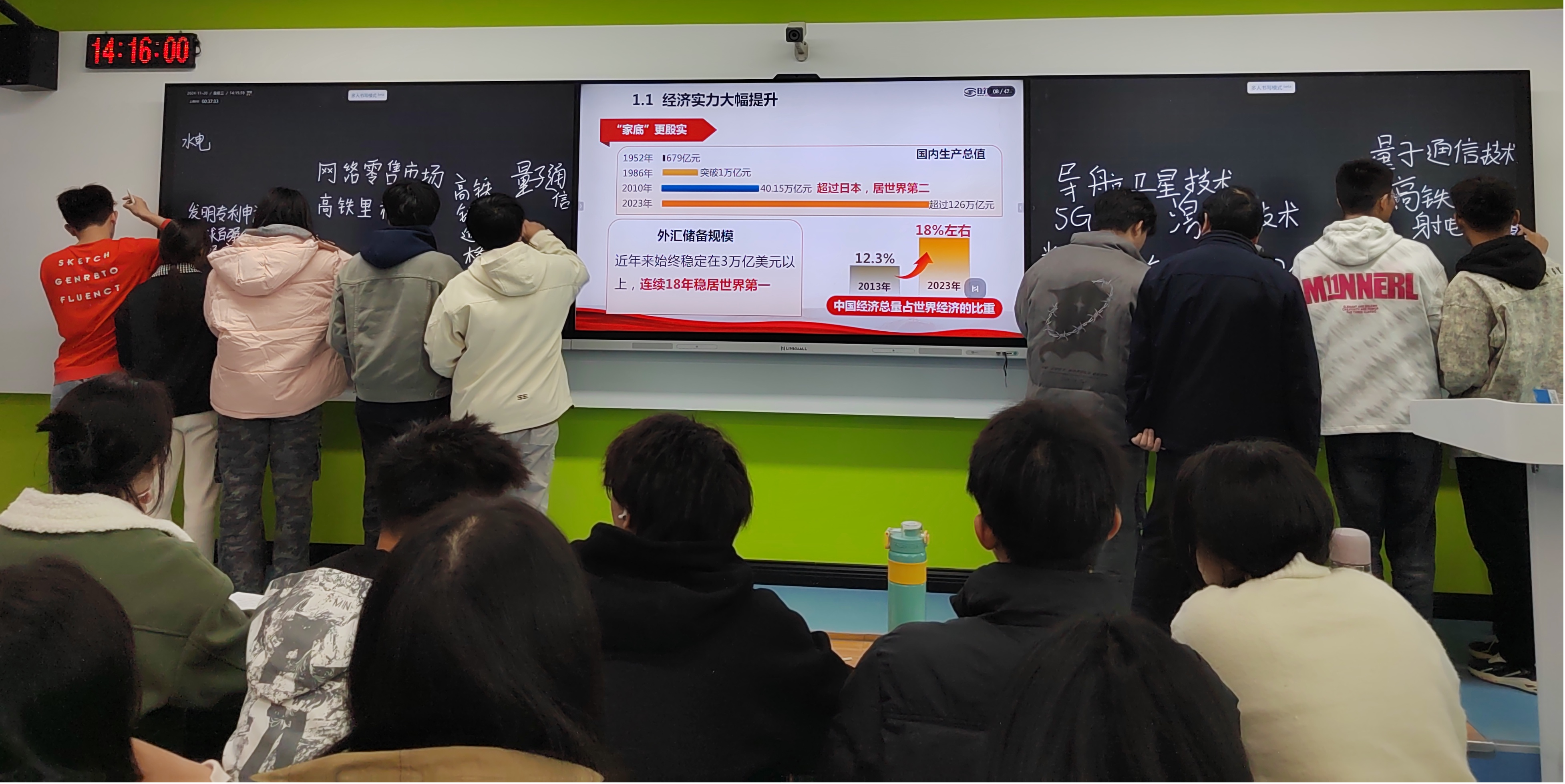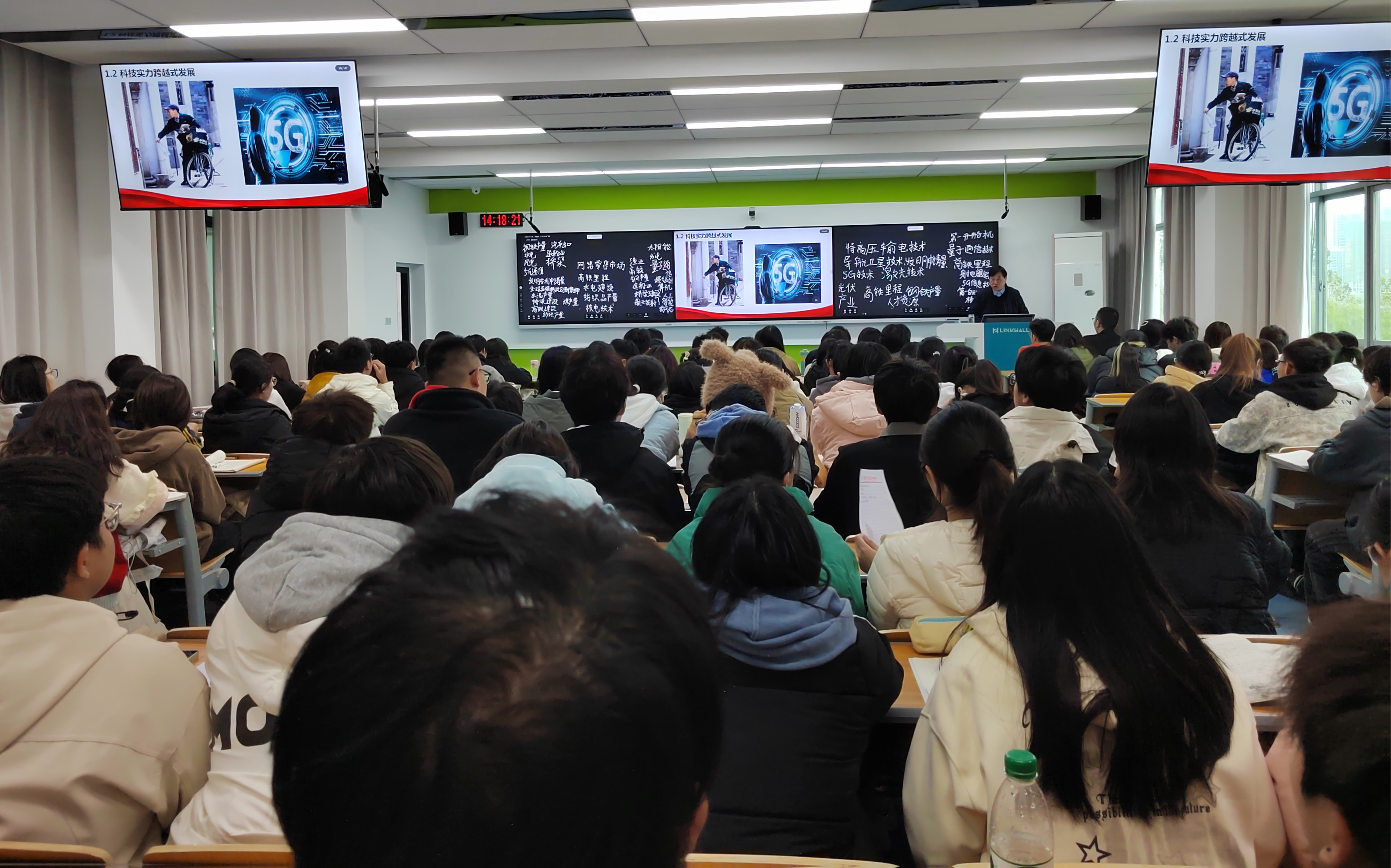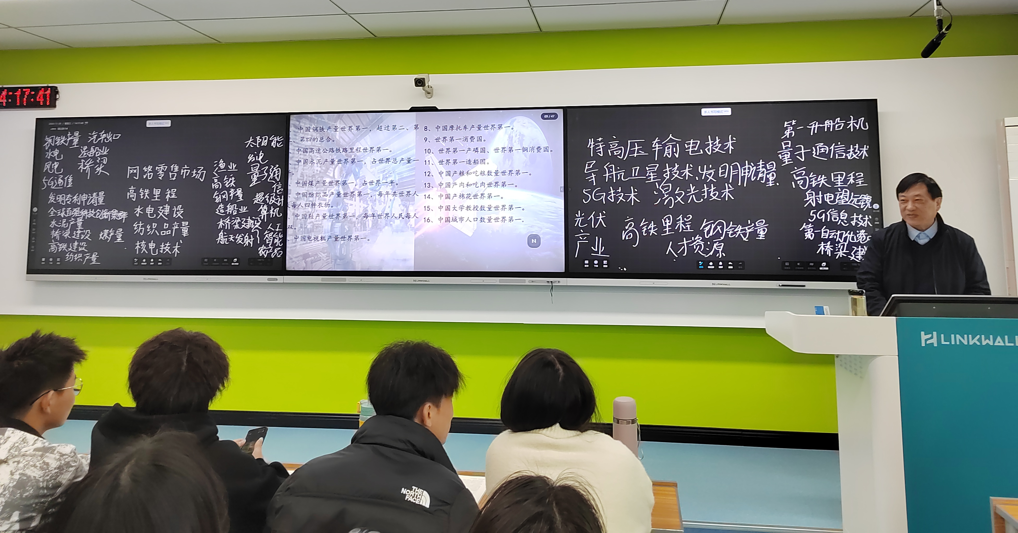 王基家以中国的国家面貌和人民生活发生了翻天覆地的变化为切入点,从经济持续健康发展、民主之路越走越宽、文化发展更加繁荣、人民生活极大改善、魅力中国焕发新颜等5个方面展开讲授,带领同学们感受75年来中国的接续奋斗所取得巨大成就,勉励同学们争做做时代的弄潮儿、强国的急先锋。