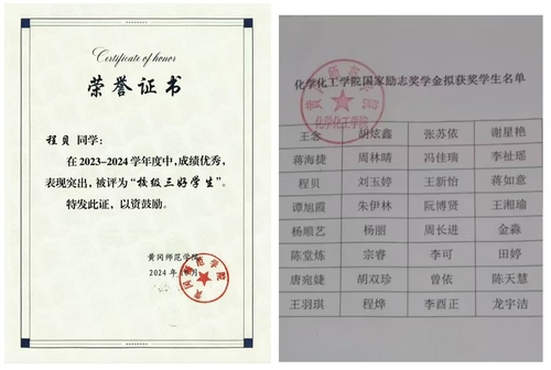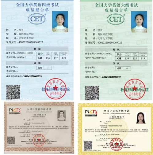 在学术上,程贝始终以勤奋和严谨为座右铭。2023-2024学年,她取得班级成绩第四、综测第一的佳绩,展现了扎实的专业功底。并且她顺利通过英语四六级考试,考取计算机一、二级证书、普通话证书及高中化学教师资格证,并已收到研究生拟录取通知,即将踏上更高的学术征程。