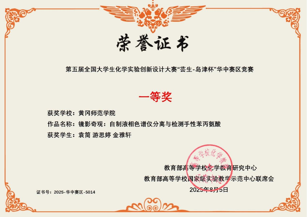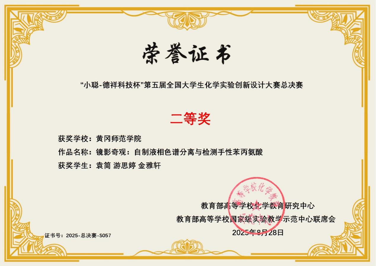 2025年8月21-24日,第五届全国大学生化学实验创新设计大赛总决赛在兰州大学落下帷幕。化学化工学院制药工程专业2023级本科生袁简、游思婷、金雅轩组成团队,在张龑、杨一思老师指导下,凭借扎实的专业功底与创新实践能力,一路披荆斩棘,以华中赛区一等奖的身份获得参加全国总决赛的资格,并在全国总决赛中荣获二等奖。